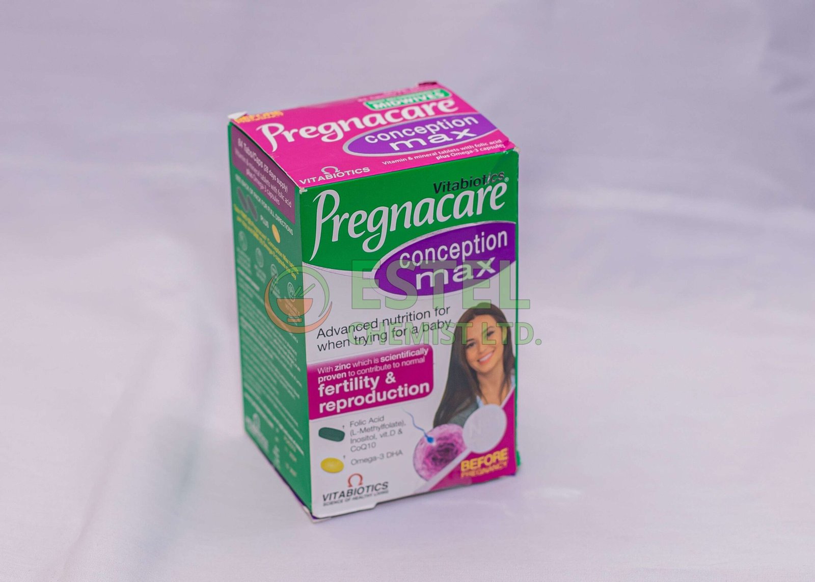 Pregnacare Conception Max is a specially formulated nutritional supplement designed to support women who are trying to conceive. It contains a comprehensive blend of vitamins, minerals, and Omega-3 fatty acids that help prepare the body for pregnancy and support reproductive health. Key ingredients include Folic acid, Vitamin D, Zinc, and DHA, which work together to support fertility and healthy early fetal development.