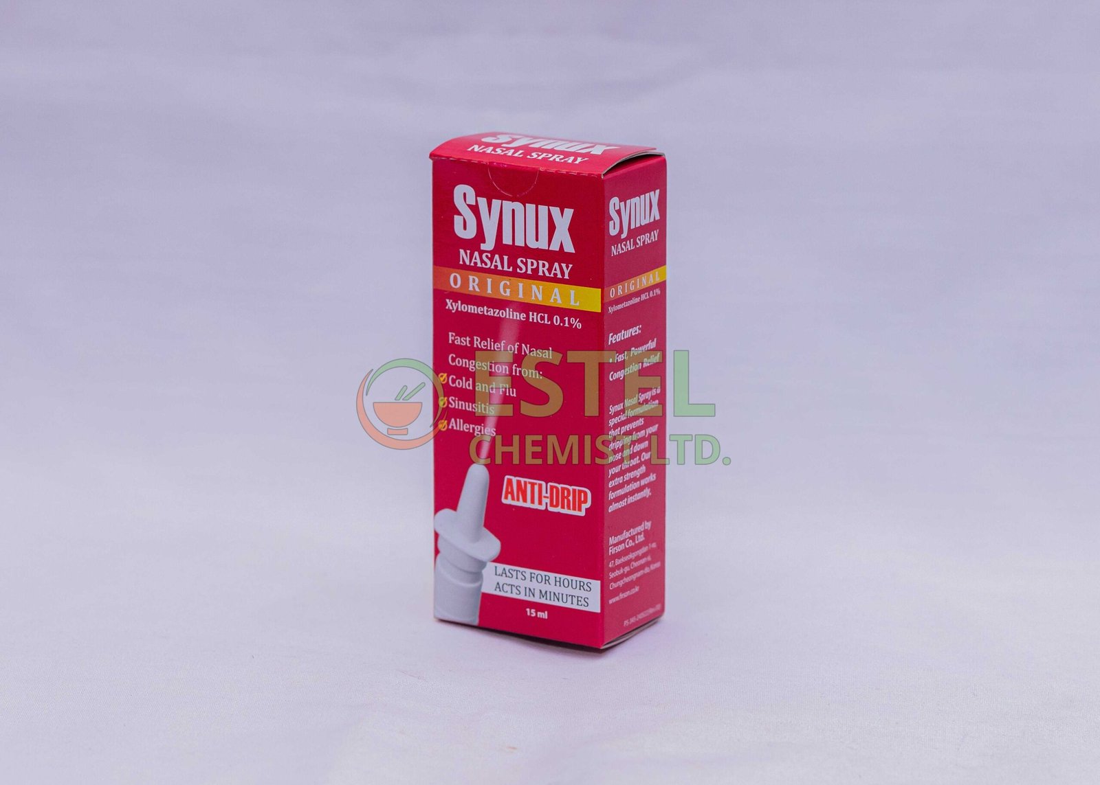Synux Nasal Spray is a nasal decongestant used to relieve blocked or congested nasal passages caused by colds, sinusitis, or allergic rhinitis. It contains the active ingredient Oxymetazoline, which works by constricting blood vessels in the nasal passages, thereby reducing swelling and allowing easier breathing.